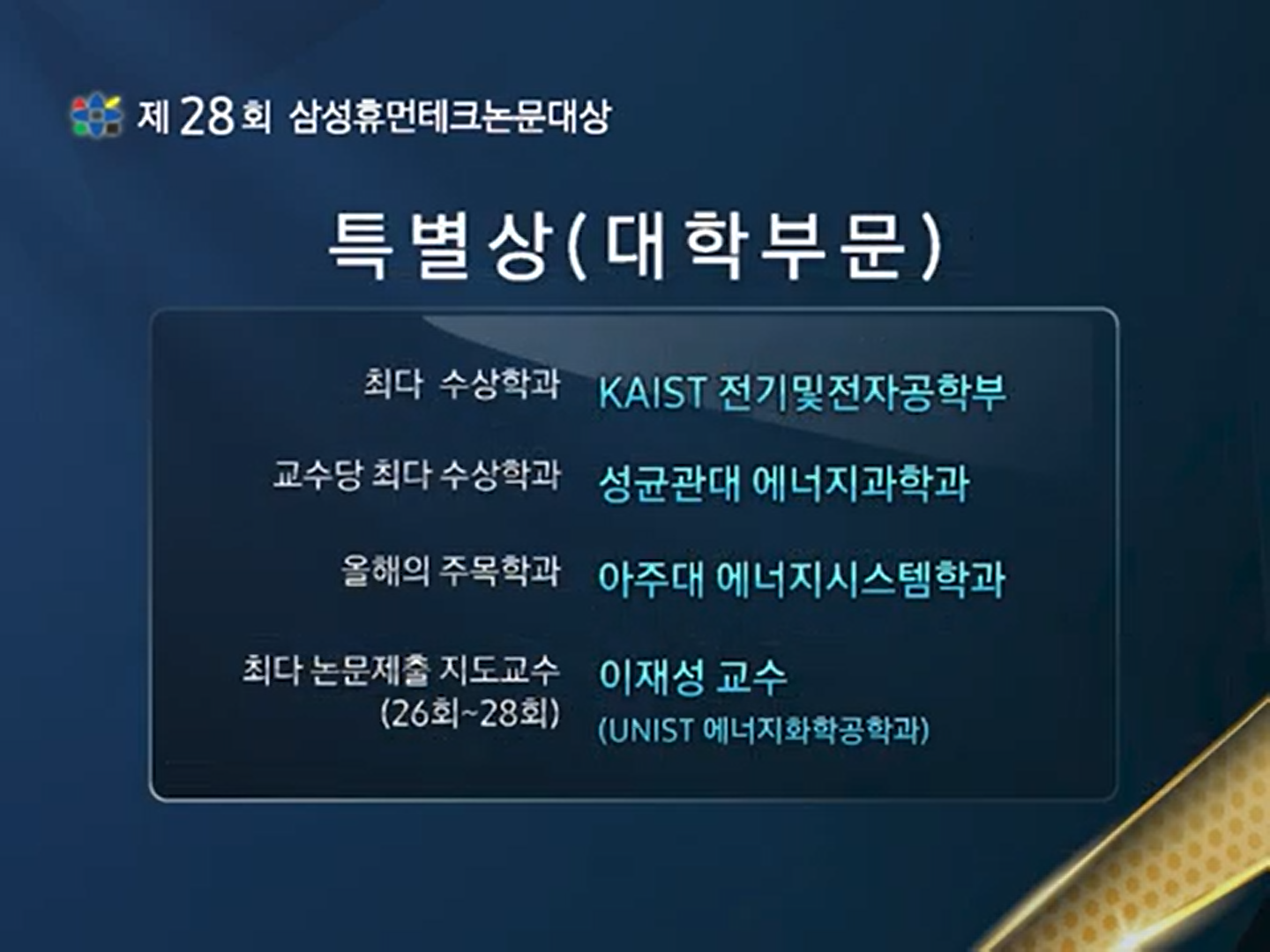 The Samsung Human-Tech Paper Awards, hosted by Samsung Electronics since 1994, aim to identify outstanding scientific talent and foster a research- and technology-oriented academic environment. The awards are divided into university and high school categories, and in addition to individual awards, a special award is presented to select the “Department of the Year” in each category.