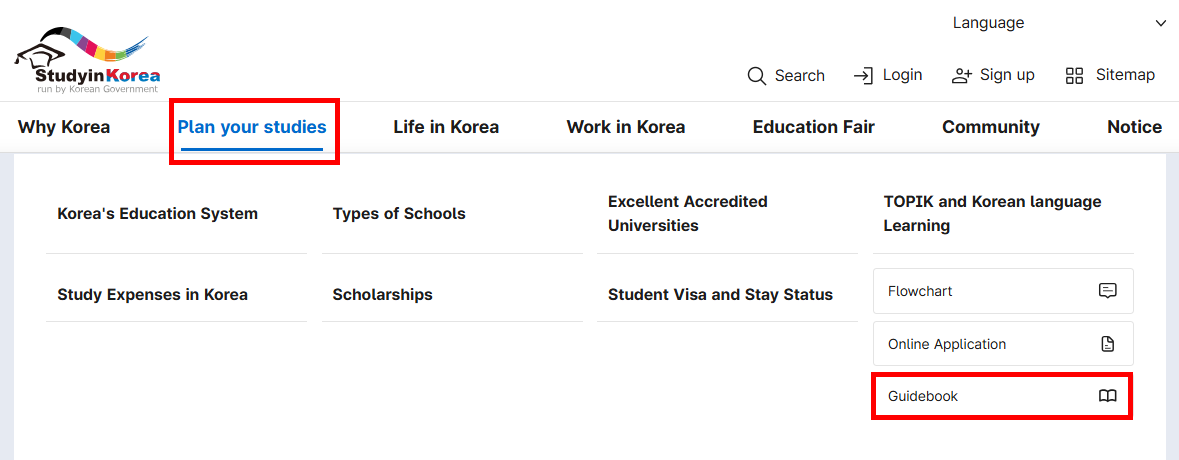 Step 1. Access Study in Korea website(https://www.studyinkorea.go.kr/ko/main.do)and click 'Plan your studies>Guidebook'