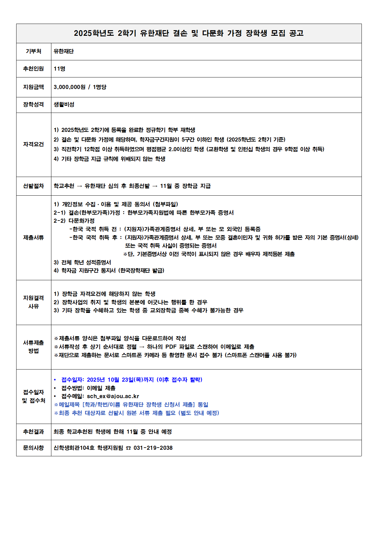 [장학] [교외장학] 2025학년도 2학기 유한재단 결손 및 다문화 가정 장학생 모집 공고 (~10.23.(목)까지)
