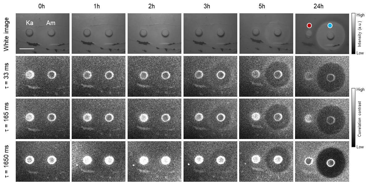 * 상단 이미지 : 레이저 스페클 영상을 통한 항생제 효과 조기 진단 결과. (맨 윗줄) 24~48시간의 세균 배양 시간이 필요했던 기존의 방법에 비해 (아래 세줄) 이번 연구 결과에서는 매우 빠른 시간(3시간) 안에 항생제 효과에 의해서 미생물 활성이 억제되는 영역을 확인할 수 있다. 시간이 지나면서 둥그런 바깥 원이 선명해지는 쪽이 항생제 효과를 보이는 경우다. 세균 주위로 박테리아 자라지 못해 경계가 더 잘 드러난다.