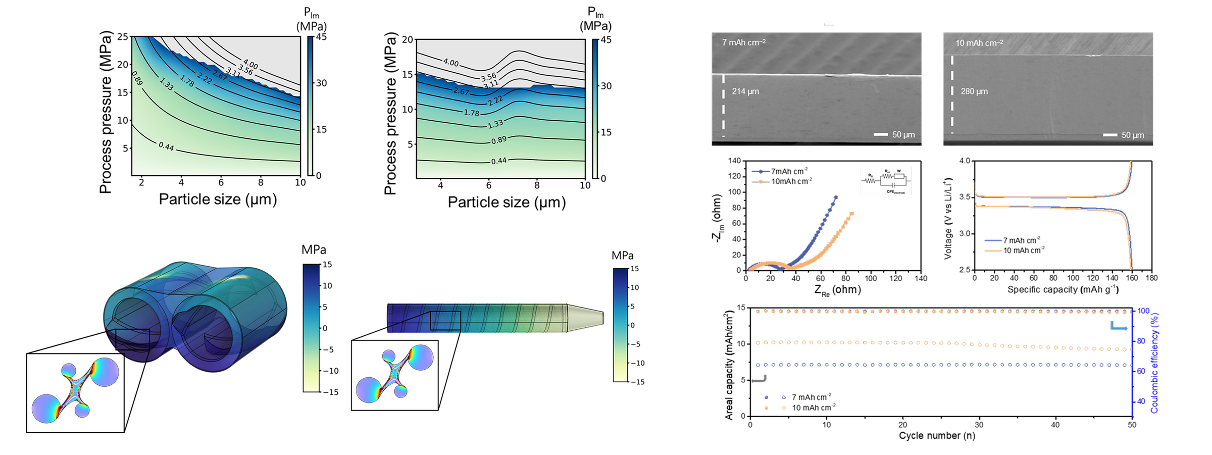 (왼쪽) 입자 크기에 따라 PTFE 바인더가 받는 응력과 변형 거동이 달라짐을 보여주는 시뮬레이션 결과. 특정 크기(10μm)에서 섬유화가 가장 잘 일어남이 확인됨
