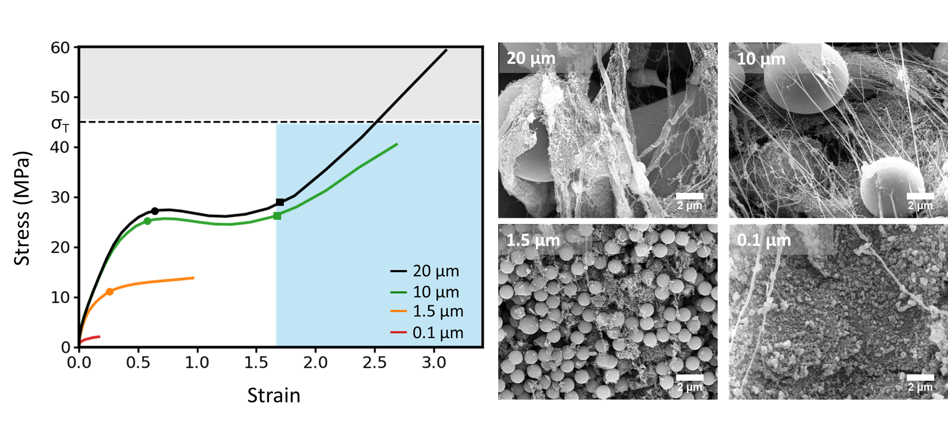 (오른쪽) 시뮬레이션 결과를 전자현미경으로 검증한 이미지. 입자가 너무 작거나 크면 섬유화가 일어나지 않거나 끊어지지만, 최적 크기에서는 거미줄 같은 섬유 조직이 형성됨