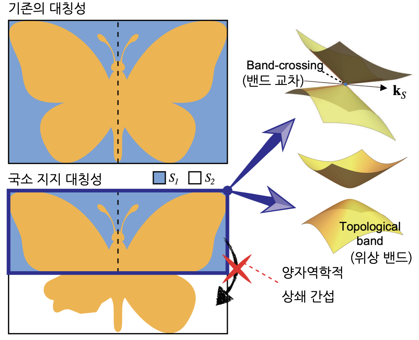 그 결과 특정 조건에서는 전자의 블로흐 파동함수가 ‘파괴적 간섭(destructive interference)’을 일으켜 대칭이 깨진 영역으로는 퍼지지 않고, 대칭이 남아 있는 영역에만 국소적으로 머물 수 있음을 밝혔다. 이 경우 전체 물질 차원에서는 대칭이 깨져 있어도, 실제 전자 상태는 사실상 대칭이 보존된 부분만을 ‘느끼게’ 되고, 그 결과 위상적 성질이나 밴드 교차점이 그대로 보호될 수 있다는 것이다.